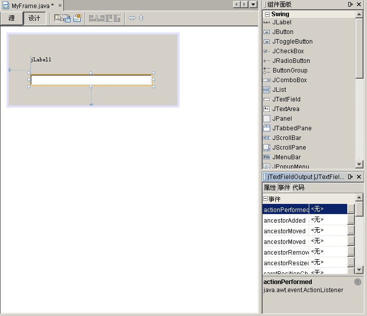 (1)选择jTextFieldOutput,在右下方面板中选择“事件”,双击第一个事件“ActionPerformed”。如图6-9所示。